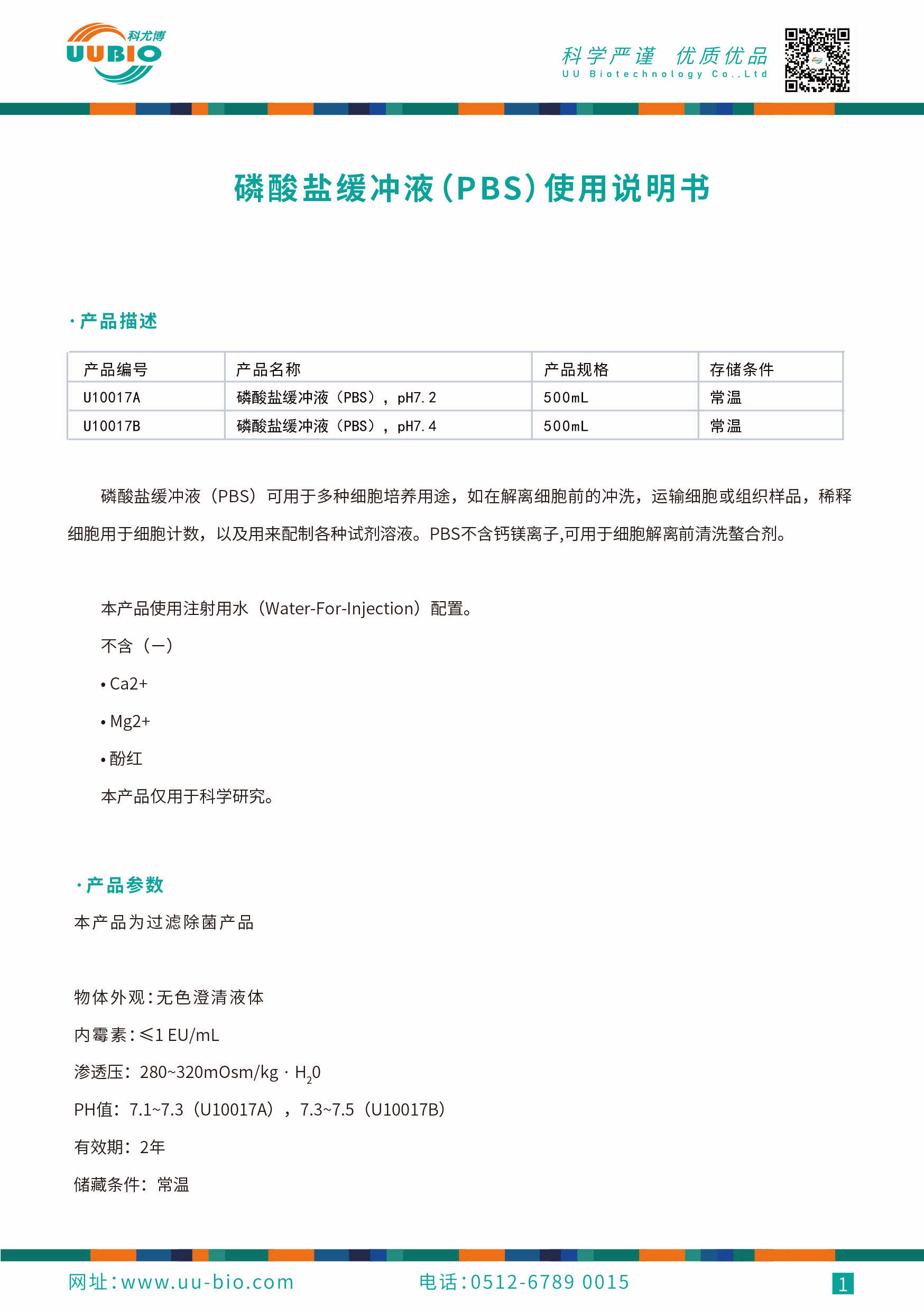 | U10017A | 磷酸盐缓冲液(PBS),pH7.2 | 500mL |