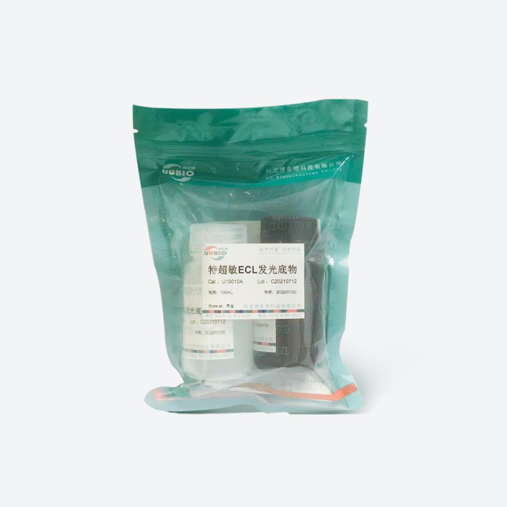 特超敏增强型化学发光显色液是辣根过氧化酶(HRP)的催化底物,可由辣根过氧化酶催化,产生化学发光反应。该试剂盒可以灵敏地检测出低至100fg级目的蛋白。本产品采用了新型的信号增强剂和氧化剂,并对成份做了优化,显著提高了产品的稳定性和发光持续时间,同时降低了显色的背景。本产品比普通ECL试剂敏感度高数十倍。辣根过氧化物酶(HRP)催化发生化学反应,发出荧光,可对X光胶片曝光,也可直接进行荧光CCD扫描。主要用于WB检测以及化学发光免疫检测系统。