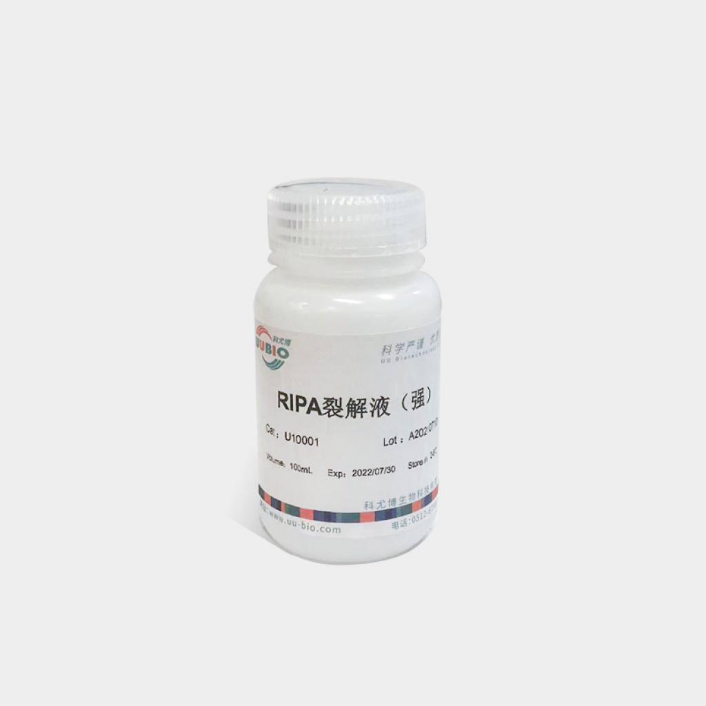 UUBIO RIPA裂解液是一种传统的细胞及组织裂解液。可快速的从细胞或组织中提取蛋白并用于常规的Western、IP、ELISA等实验。RIPA裂解液根据其裂解强度可分为弱,中,强三种。UUBIO RIPA裂解液(强)成分明确,主要成分为:25 mM Tris (pH 7.6)、150 mm Nacl、1% NP-40、 1% sodium deoxycholate、0.1% SDS等。